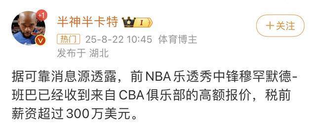 据媒体人《半神半卡特》透露,有cba球队给前nba中锋班巴开出了一份税前超过300万美元的合同。CBA外援工资帽也只有425万美元,这意味着这支球队准备超帽交税了,具备这种资金实力的球队并不多,又渴望争夺总冠军,北京首钢男篮、上海男篮和山西男篮都有可能成为班巴的下家,班巴是2018年nba首轮6号秀,整个nba生涯中规中矩,若他能加盟cba,将会成为头号大牌外援。